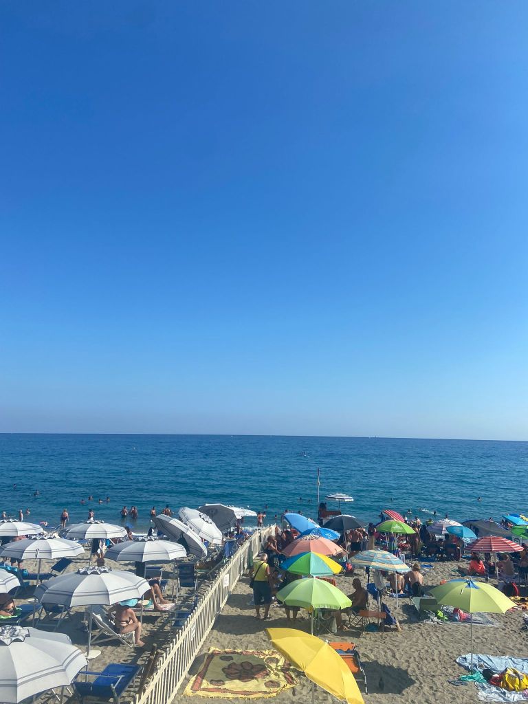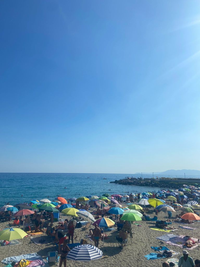 Finale Ligure’nin sahilinde birçok denize girmek için yer var. Bu yerlerin çoğu özel plajlar yani sağladığı hizmet için sizden para alıyor. Bu tarz özel plajlarda 2 şezlong, 1 şemsiyenin günlük fiyatı 30-50 Euro arası değişiyor. Bunun içinde yiyecek/içecek yer almıyor. Biz tabii Euro’yu 30 la çarptığımız için halk plajlarını (Spiaggia Libera) tercih ettik. Bu sebeple de kendimize kasabada bulunan bir marketten 13 Euro’ya şemsiye aldık (sonra bu şemsiyeyi uçakla TR’ye de getirebiliriz diye düşündük ama bagaj hakkımız olmadığı için havalimanında şemsiyemize el koydular 😌). Şemsiyemizle her gün halk plajının tadını çıkardık. Suyu çok temiz ve berraktı. Ayrıca zemini de kumdu. Suyun sıcaklığı da tam istediğim gibi orta dereceydi. Yani biz denizini de baya baya sevdik. Öğle yemeği için de ya marketten sandviç aldık (hemen sahile paralel PENNY Market var) ya da özel plajlara giderek yemeği orada yedik.