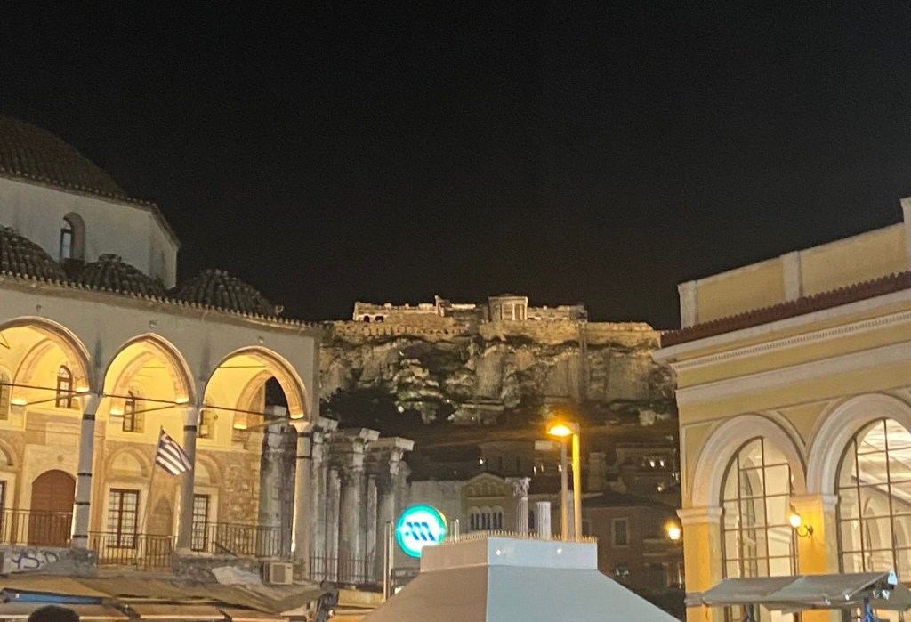 Otelimiz Monastiraki meydanına yürüyerek 7 dakika uzaklıktaydı. Otelden çokça memnun kaldık bu sebeple Gaia Athens oteli sizlere de önermek isterim. Çalışanlar çok yardımseverdi, kahvaltısı gayet güzeldi ve otelin konumu baya merkeziydi. Otele vardığımızda akşam saat 11’e geliyordu, açlıktan ölmek üzere olduğumuz için hemen bavulları bıraktıktan sonra meydana geri dönerek aç karnımızı gyrosla doyurduk. Restoran olarak hemen meydanda yer alan The Greco’s Project’i tercih ettik. Dönerlerin fiyat 4,30 Euroydu. Biz 2 döner 2 biraya toplamda 19 Euro verdik. Yemek üstüne sağ olsunlar bize tatlı getirdiler. Geçen yaz da arabayla Yunanistan’a gittiğimizde bu olay çok hoşumuza gitmişti. Genelde restoranlar yemekten sonra tatlı, meyve, likor vs ikram ediyorlar. Türkiye’de artık bu olay kalmadı, bizdeki restoranlar neredeyse çay bile ikram etmez hale geldiler. Bir de kimse bana kızmasın ama yurtdışındaki dönerler bana daha lezzetli geliyor. O içine koydukları yoğurtlu sos bence dönerin ağır tadını bastırıyor ve çok yakışıyor. Yemekten sonra Acropolis’i selamlayarak otele yürüdük ve uyuduk.